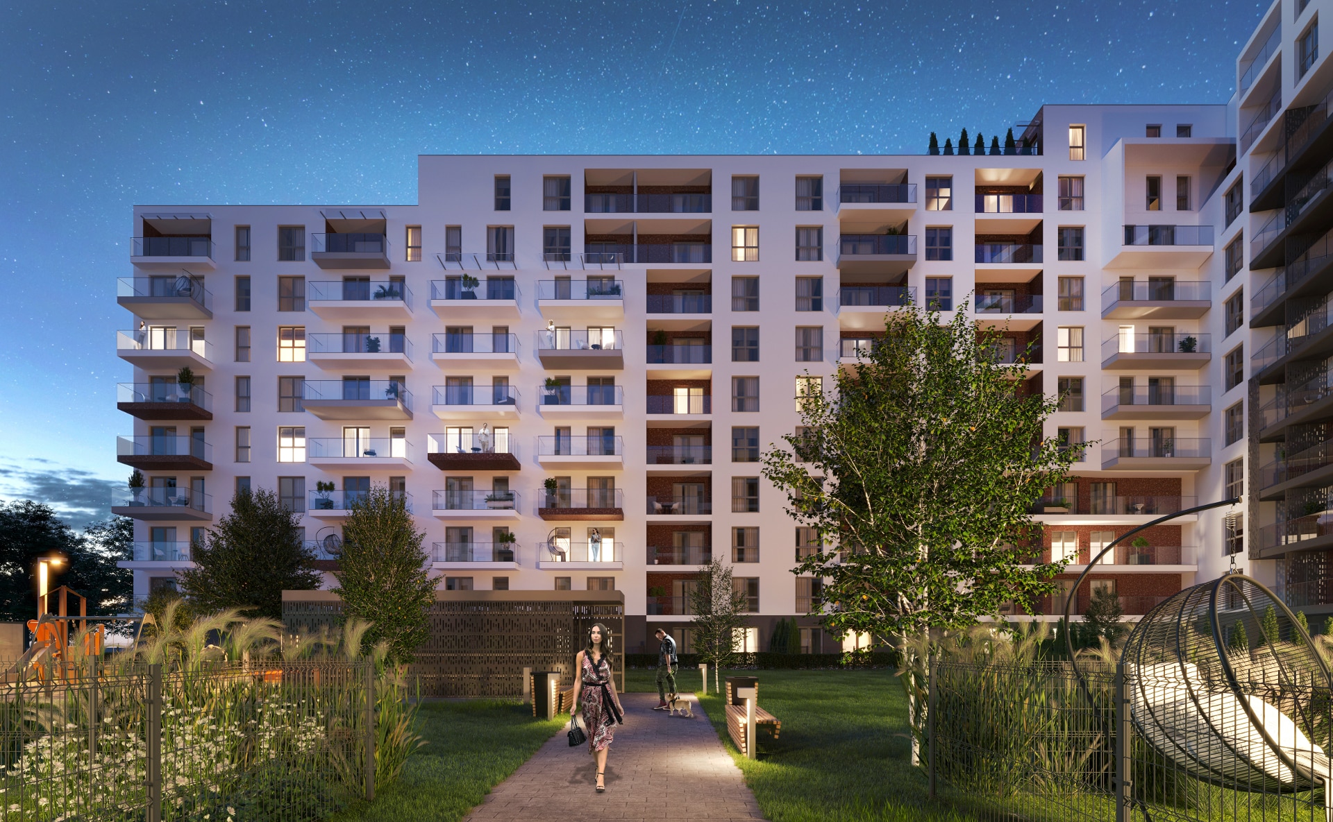 Otoczenie wokół budynku będzie przemyślane i gustowne oraz spójne z wcześniejszym etapem. Wewnętrzny dziedziniec stanie się strefą rekreacji i wypoczynku dla przyszłych mieszkańców, a elementy małej architektury takie jak ławki czy nasadzenia podkreślą unikatową architekturę budynku. Dla najmłodszych powstanie także plac zabaw.